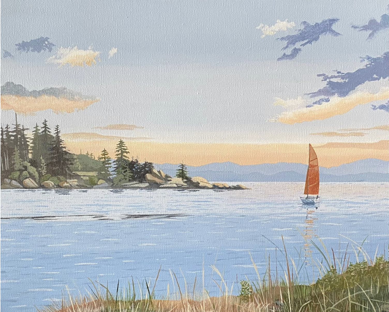 This is a 16" x 20" piece - smaller than my usual - but it gave me a chace to focus on the soft glow of a late afternoon by the water. Painting in these soft sunset colours made my acrylic look almost like a watercolour, which was a fun twist. $325